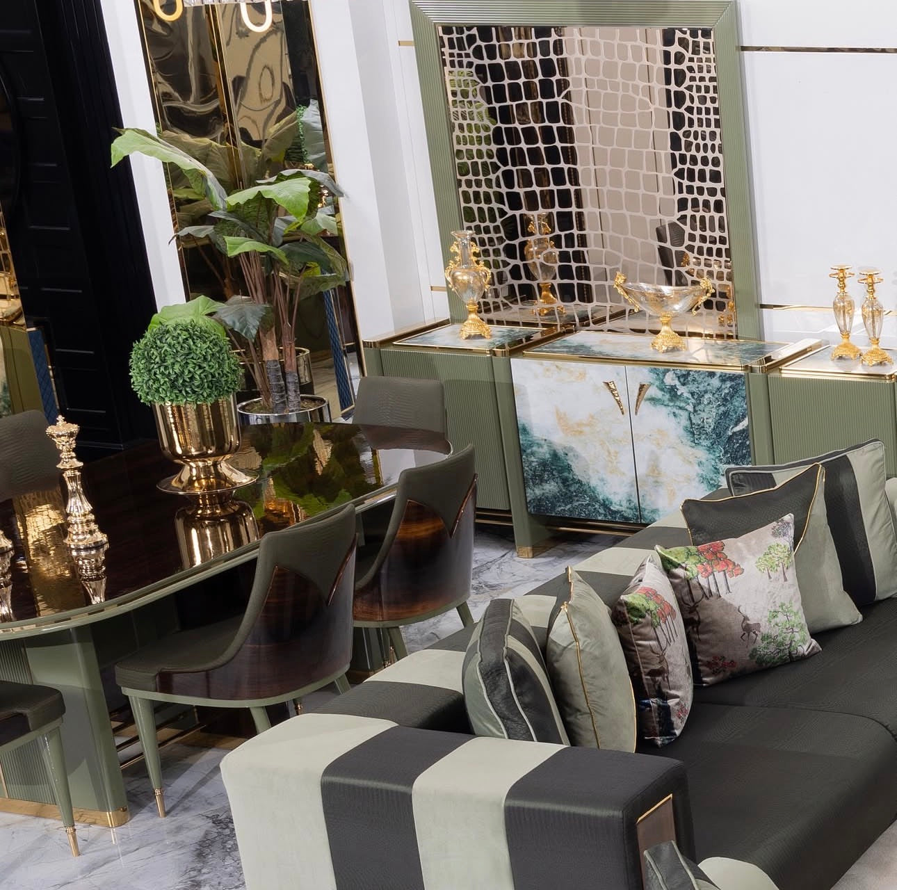 The Crest collection brings together rich materials and refined craftsmanship to create a bold yet elegant interior statement. Deep wood finishes, sculptural marble surfaces, and subtle gold accents establish a luxurious foundation, while tailored upholstery and structured silhouettes introduce balance and comfort. The dining space features a polished table and modern chairs that highlight the collection’s architectural presence, while the living pieces complement the space with refined textures and strong form. Crest is designed for interiors that celebrate dramatic materials, sophisticated detail, and timeless luxury.