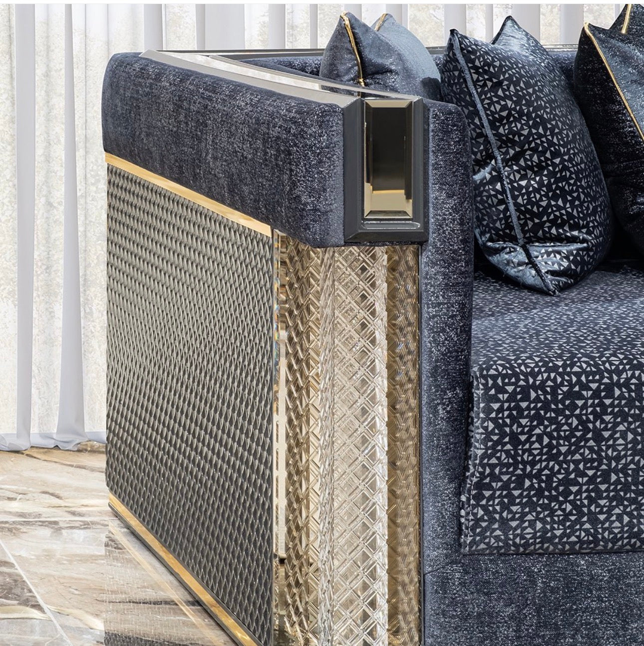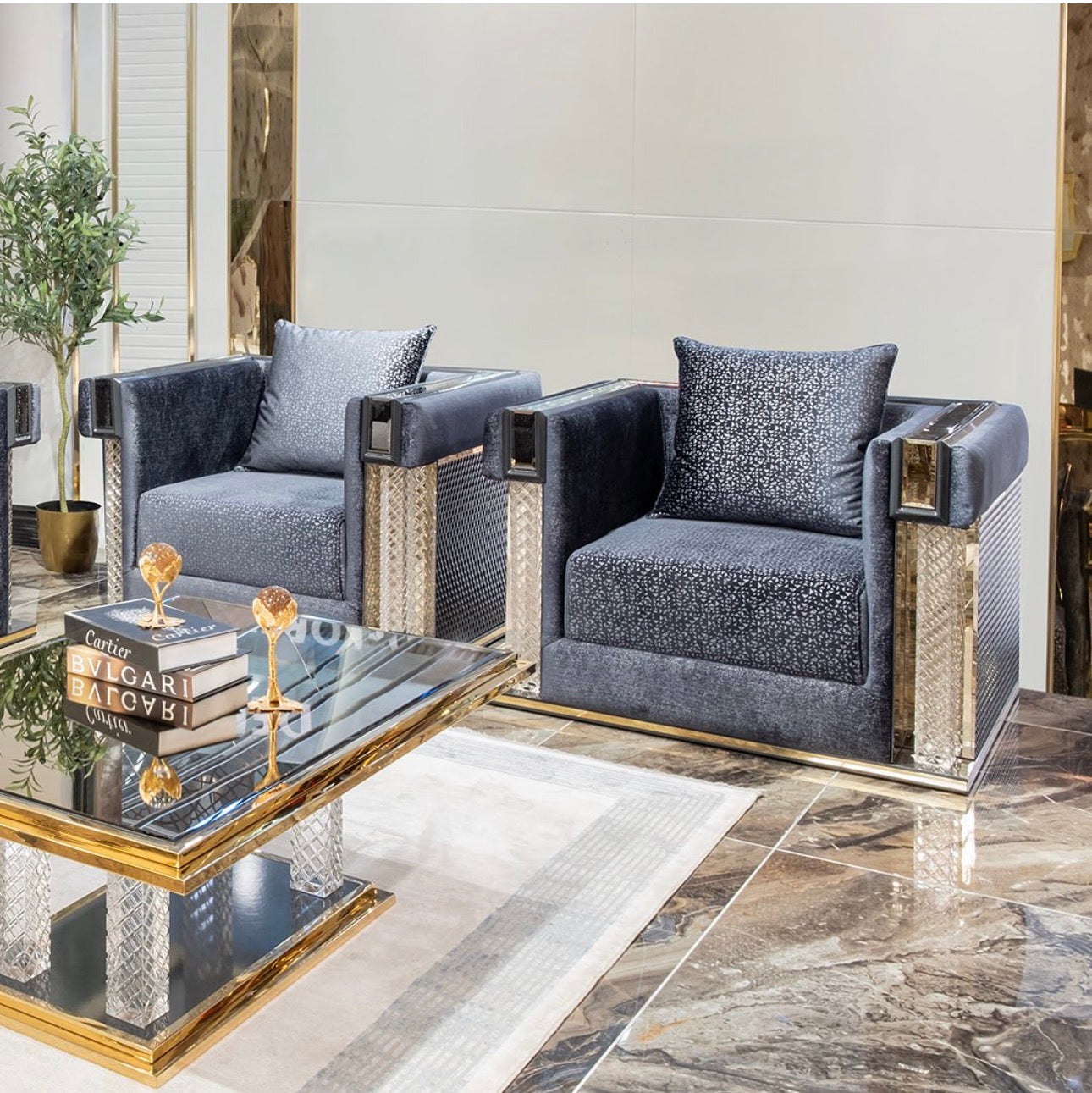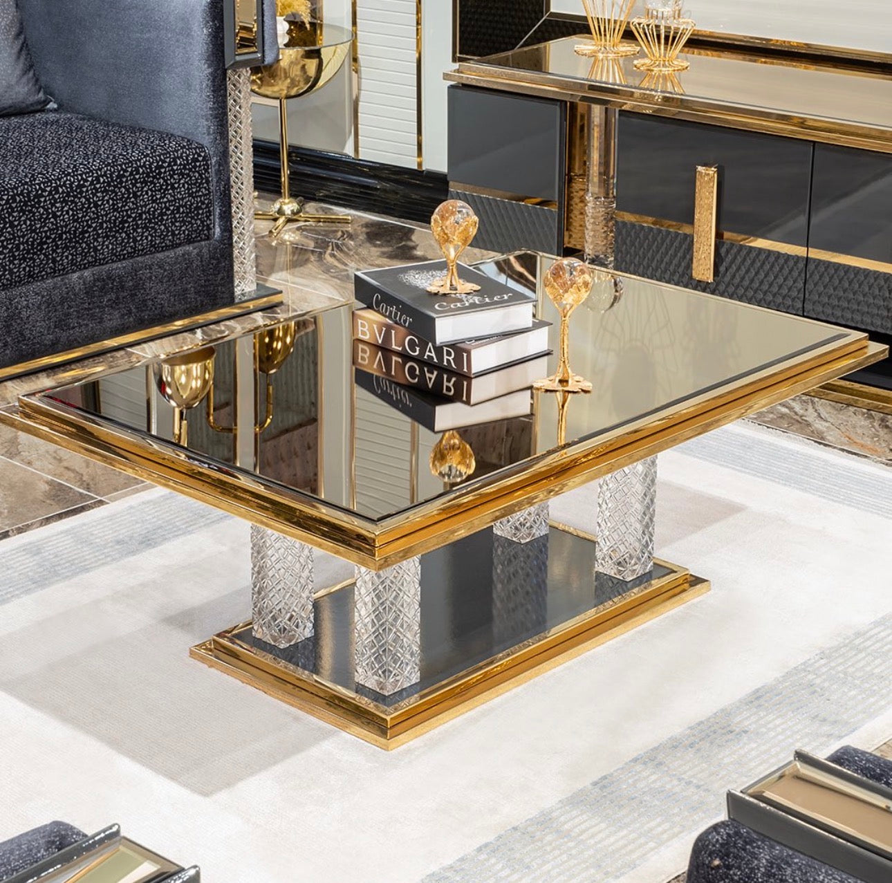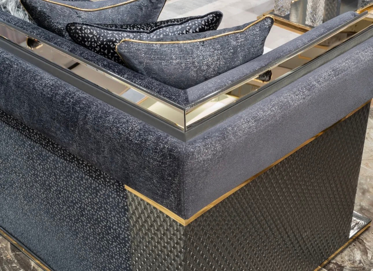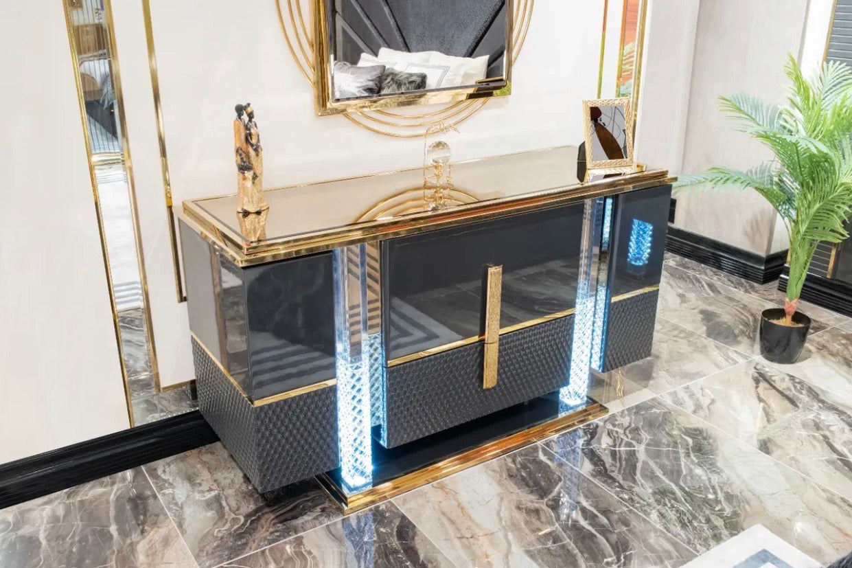 Deep charcoal tones, polished metallic details, and sculptural silhouettes define the collection’s identity. Upholstered seating is framed by strong geometric forms and warm gold accents, creating pieces that feel both modern and timeless.