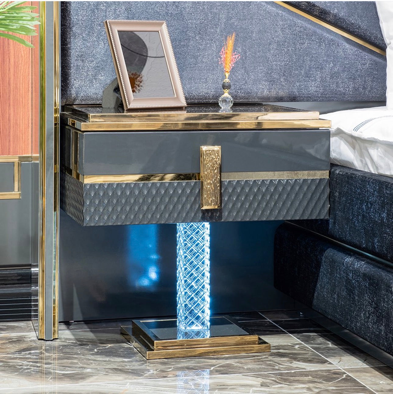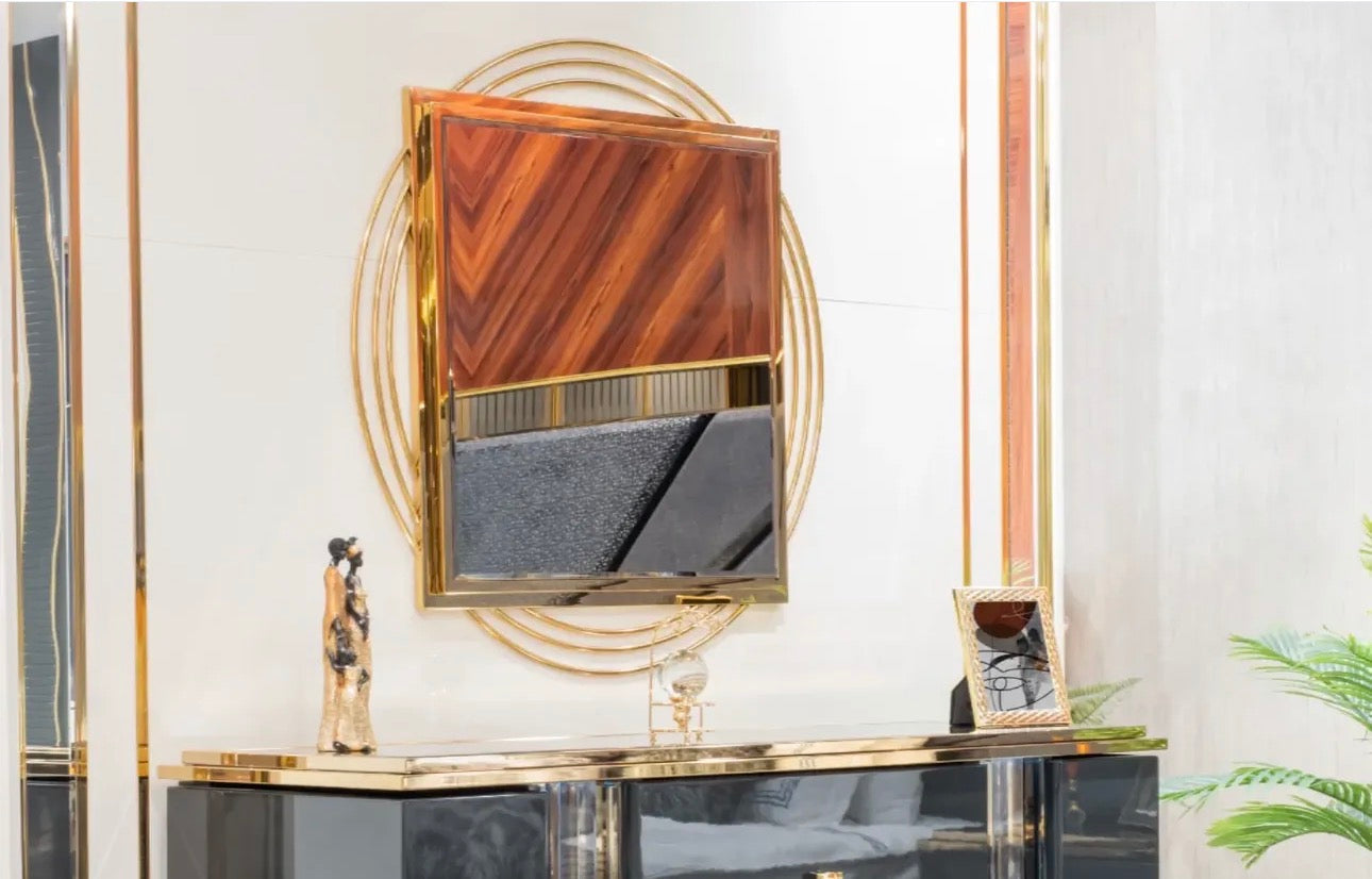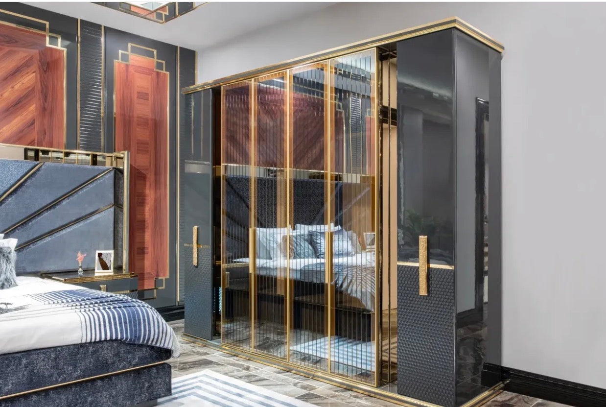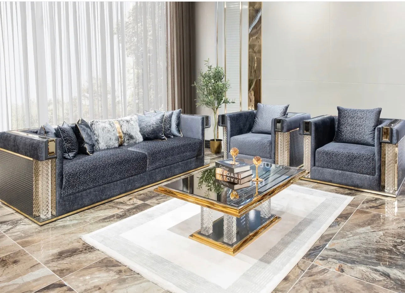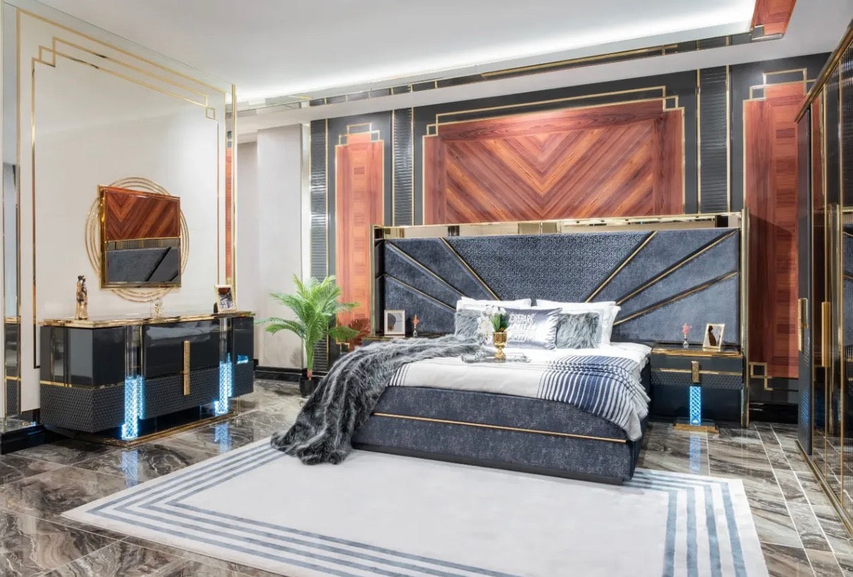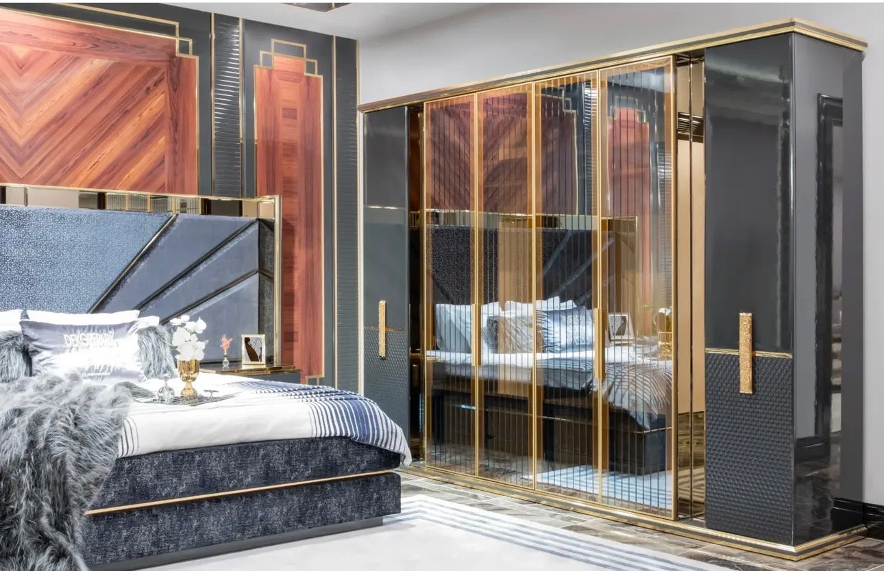 Deep charcoal tones, polished metallic details, and sculptural silhouettes define the collection’s identity. Upholstered seating is framed by strong geometric forms and warm gold accents, creating pieces that feel both modern and timeless.