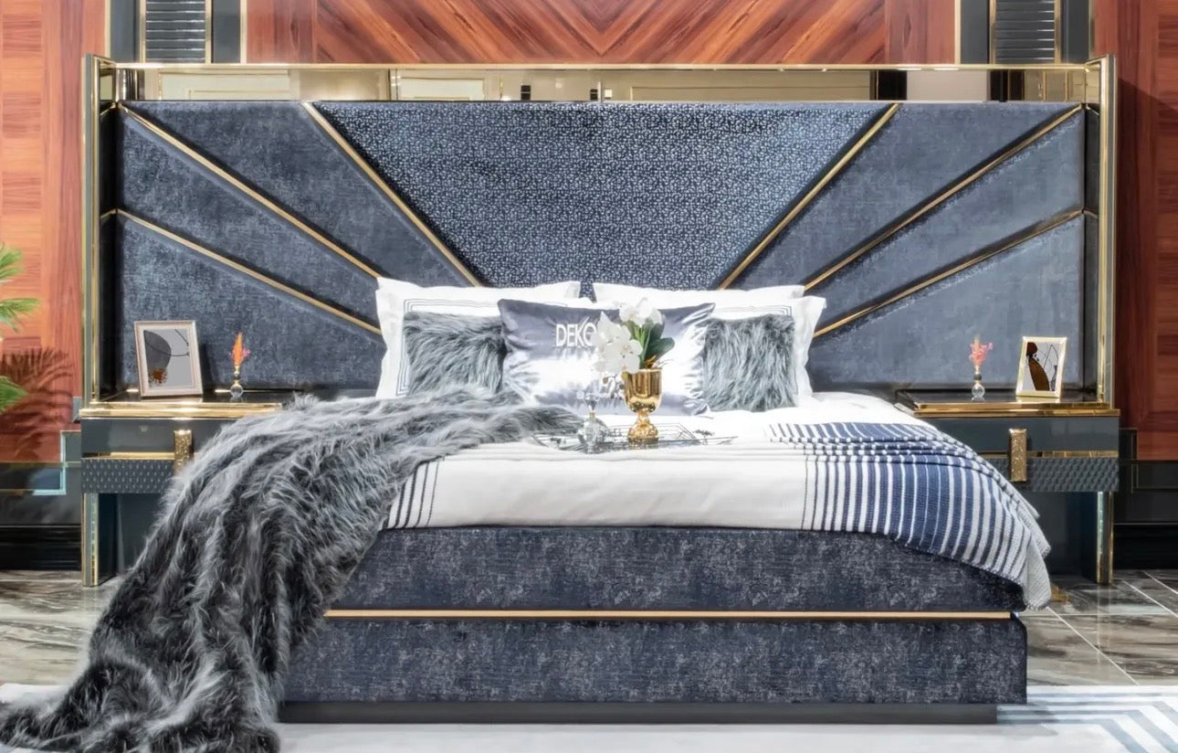 In the living environment, structured sofas and armchairs form a balanced arrangement around layered statement tables, creating a space designed for conversation and presence. The bedroom setting continues the design language with a dramatic upholstered headboard framed by metallic lines, while the dining environment introduces intricate detailing and sculptural chairs that transform the table into a centerpiece.