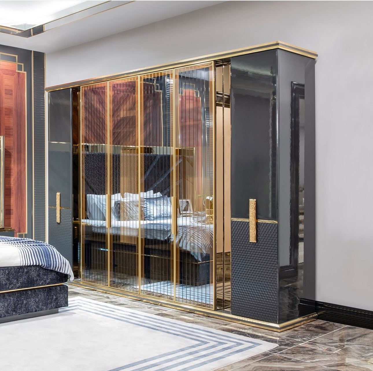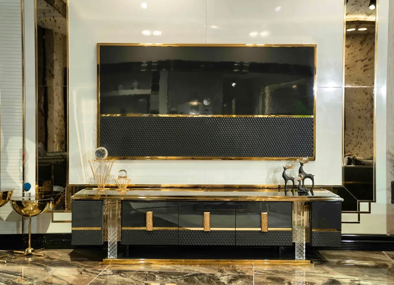 Throughout the collection, reflective surfaces, bold textures, and strong symmetry create interiors that feel rich, atmospheric, and elevated.