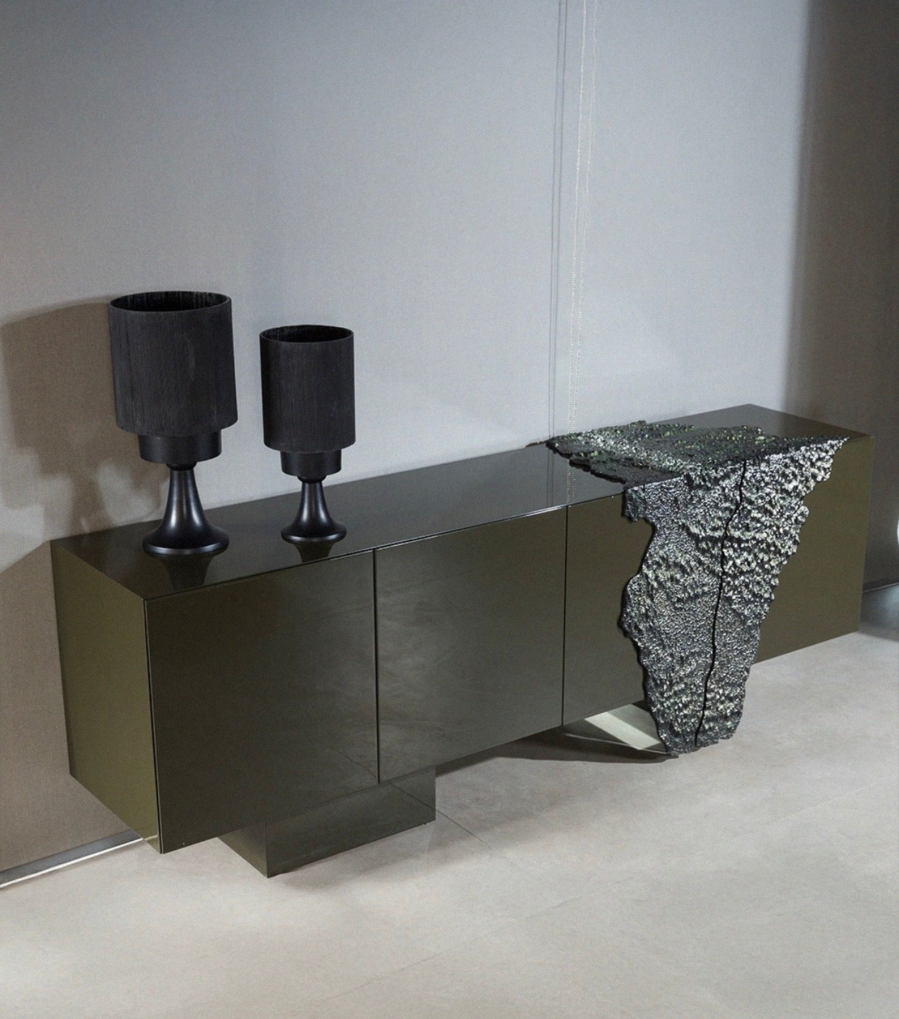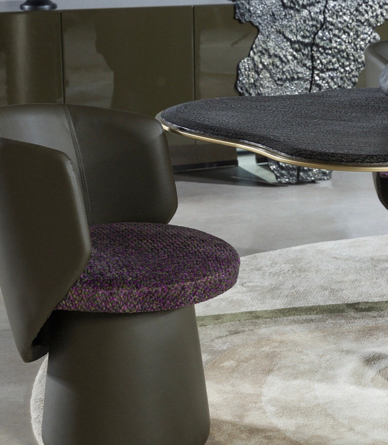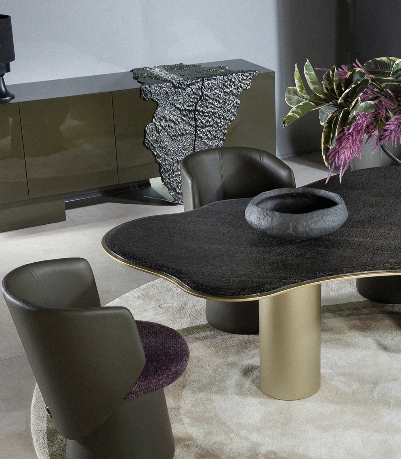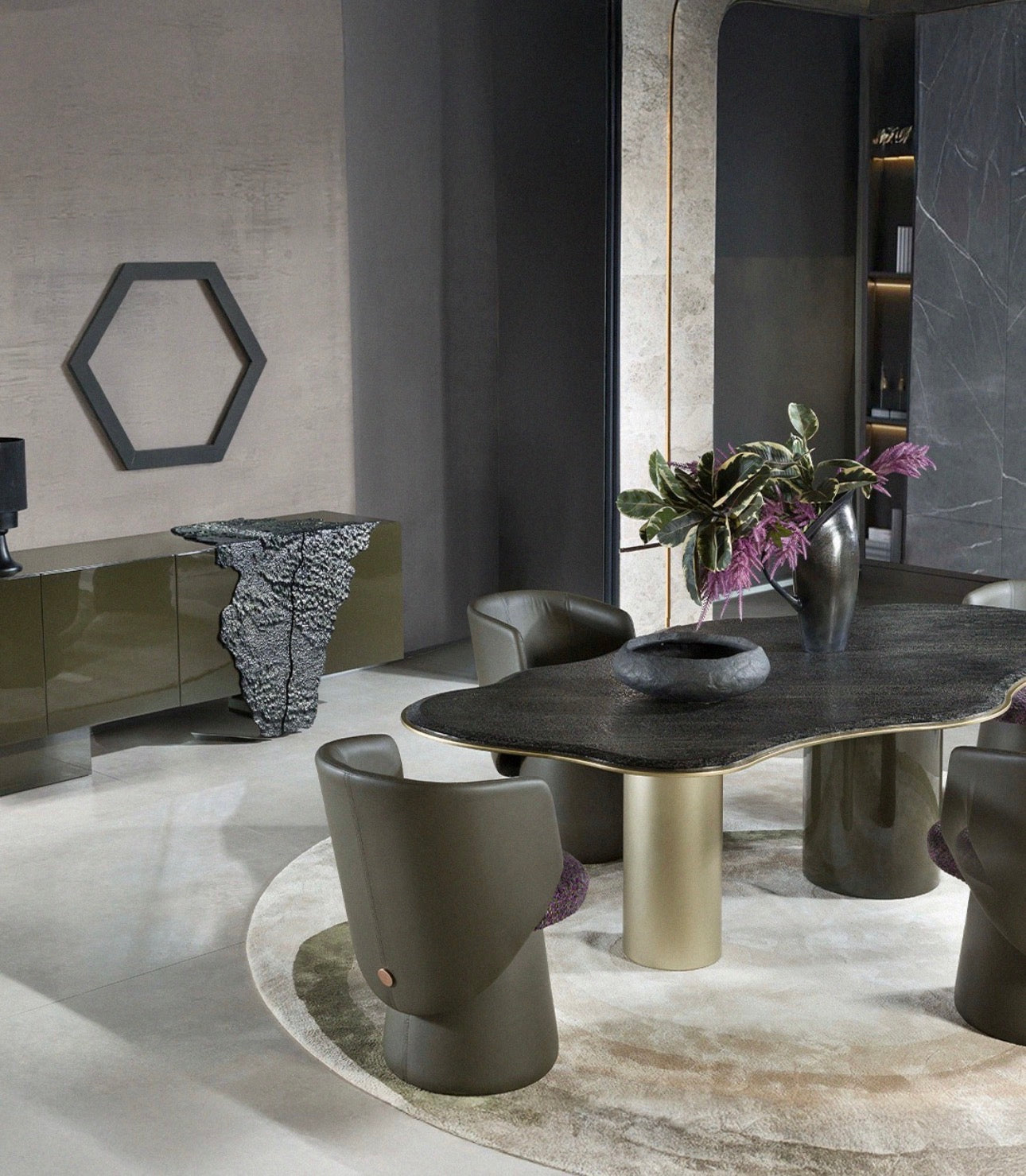 Together, these pieces create a cohesive luxury furniture environment that blends dining, lounge, and statement storage elements into a unified design language.