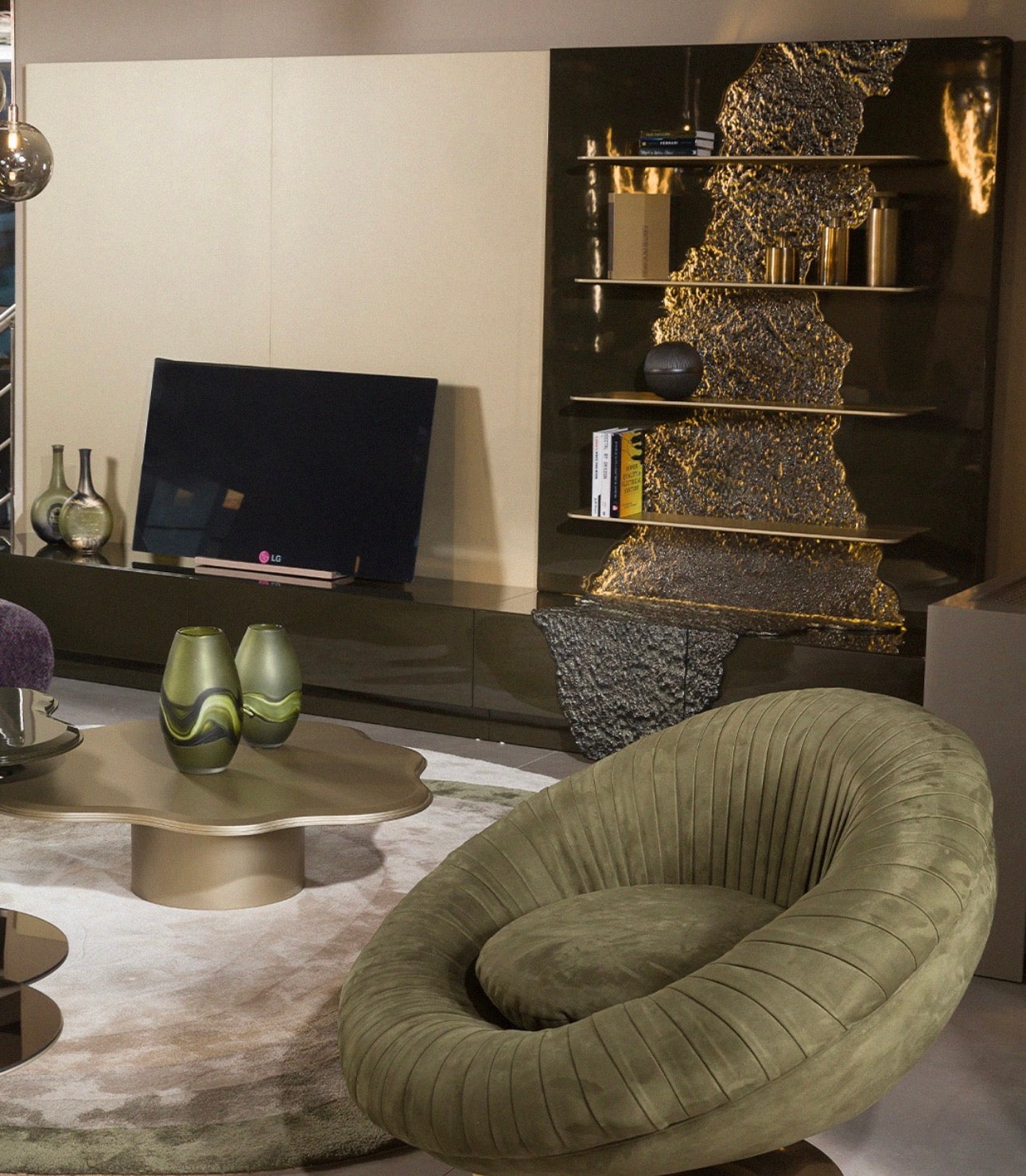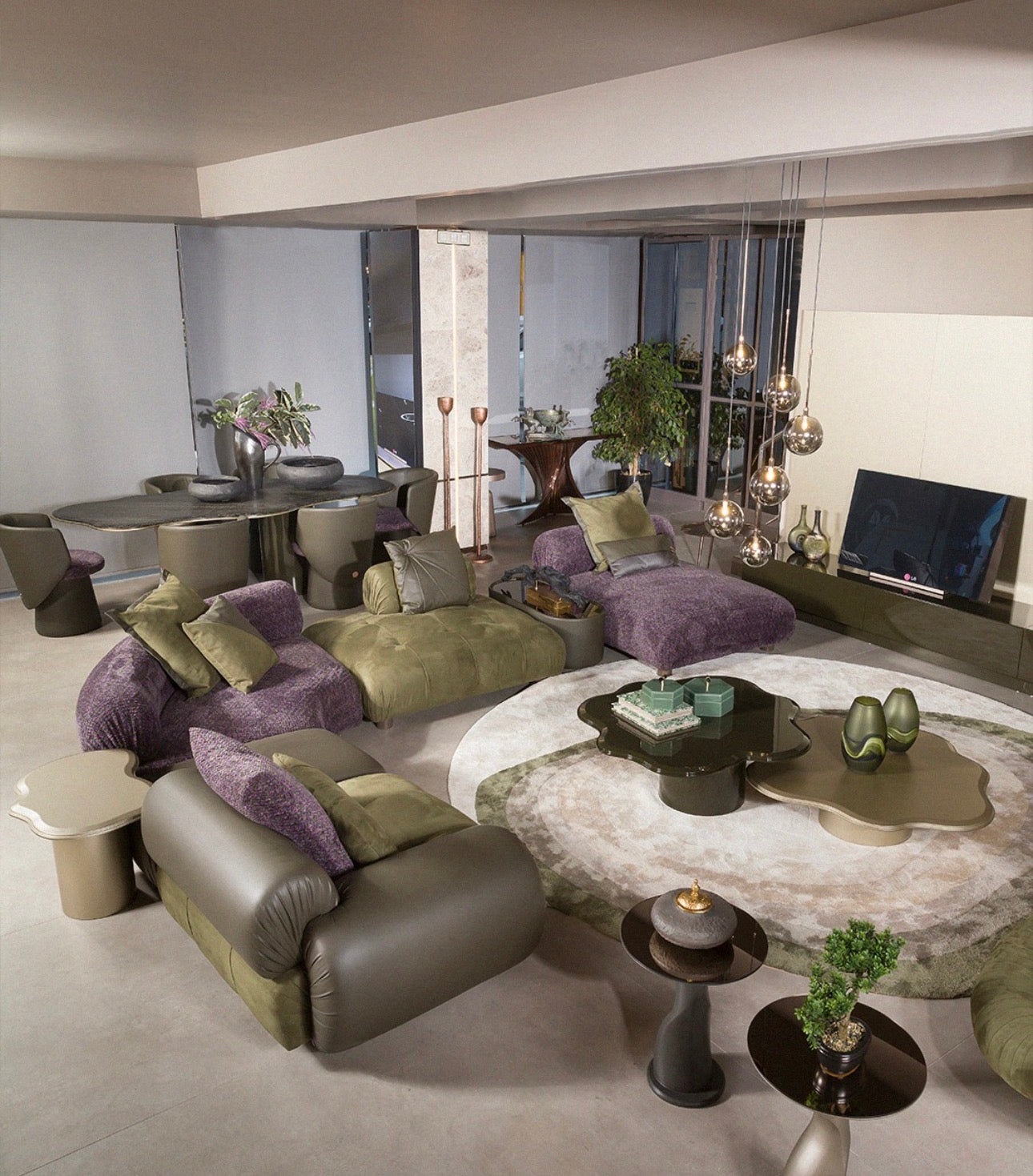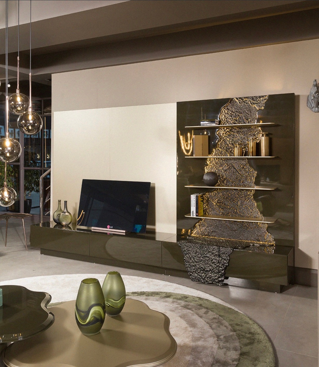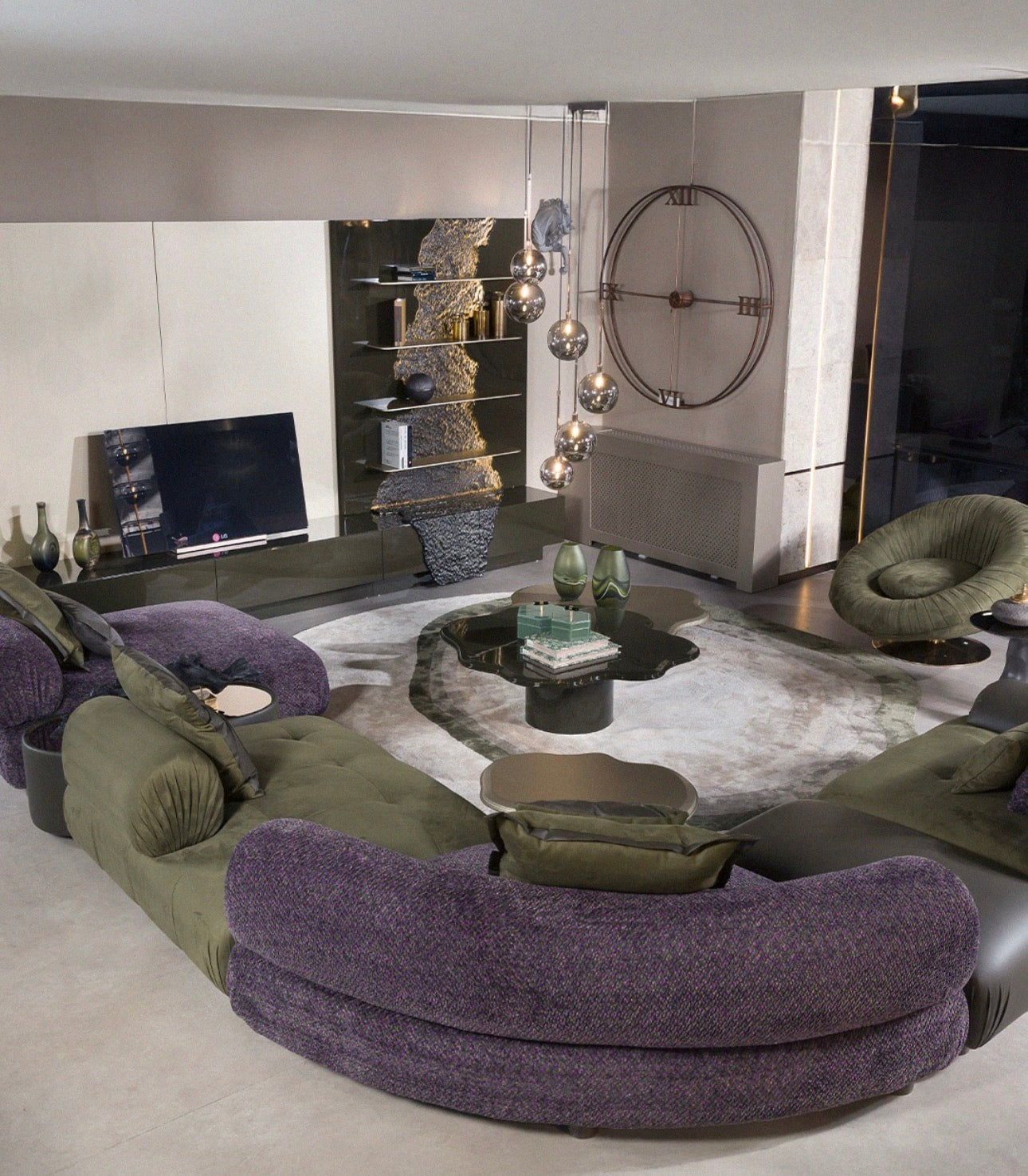 In the living area, a curved sectional sofa anchors the room with deep seating and rich upholstery that enhances both comfort and visual impact. Sculptural accent tables, artistic consoles, and architectural shelving pieces introduce organic textures and bold surfaces that feel both functional and gallery inspired.