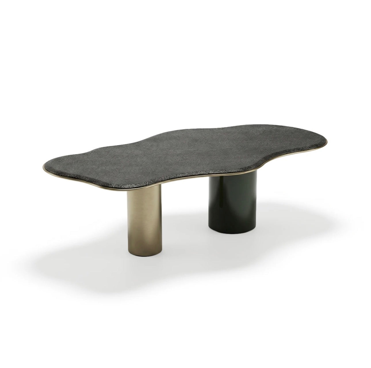 The collection features a statement dining environment centered around a curved dining table supported by cylindrical bases and finished with a softly contoured edge that adds movement and visual balance. Surrounding dining chairs introduce smooth forms and refined materials that create a cohesive, modern dining space.