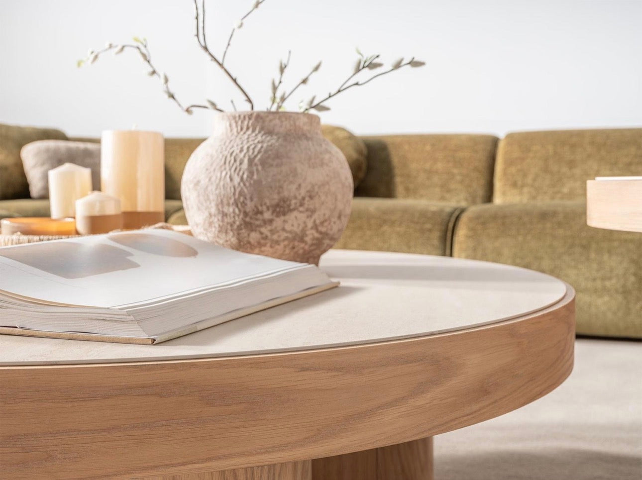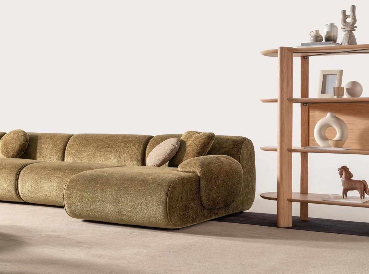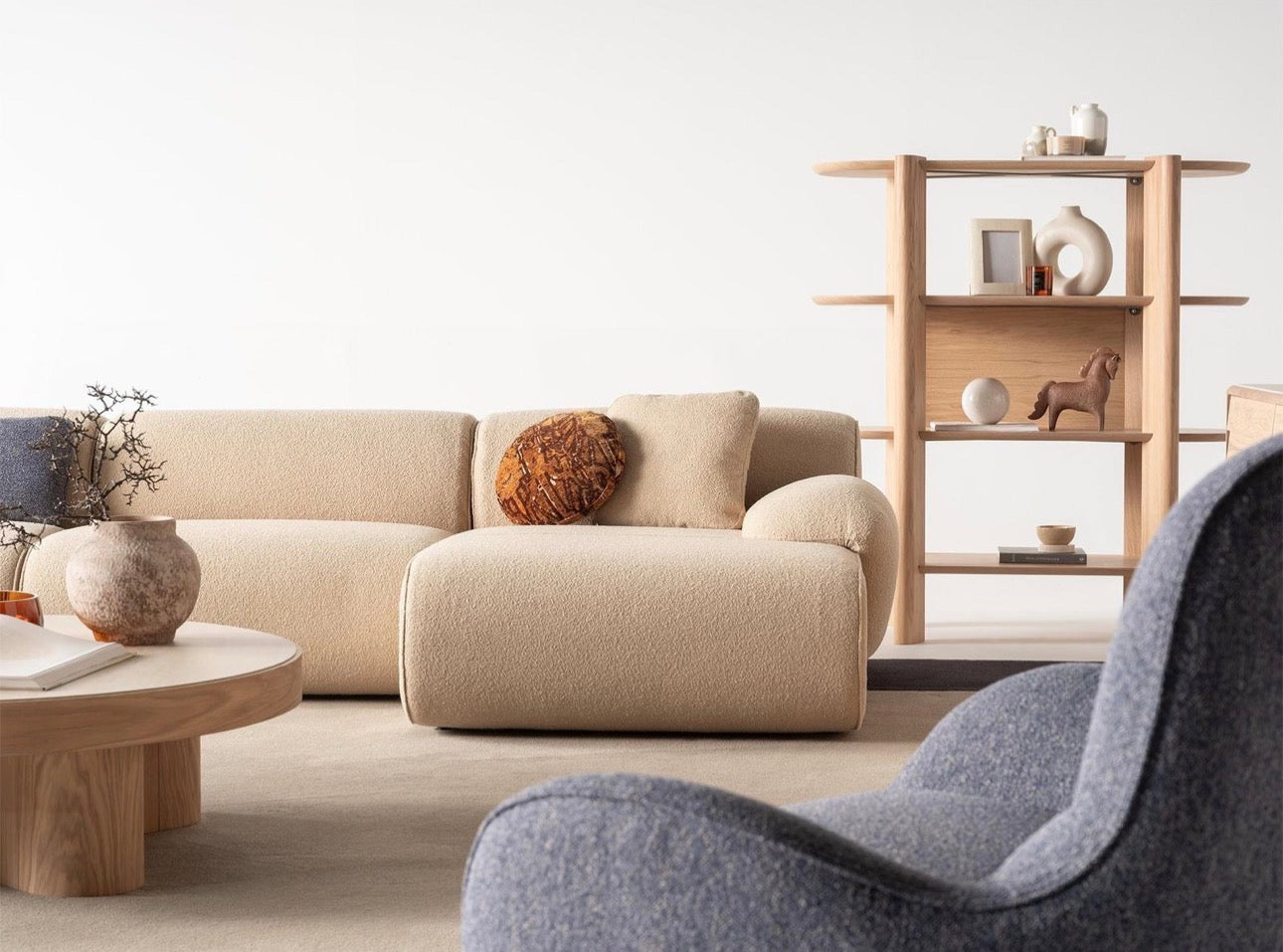 Lumen is a warm, sculptural living collection inspired by natural light, organic textures, and relaxed architectural forms. A generously curved sectional anchors the room, paired with minimalist wood tables and soft rounded seating that create an atmosphere of calm sophistication. Neutral tones, natural materials, and airy spacing allow light to move freely through the space, giving the collection a serene and grounded presence. Lumen is designed for interiors that embrace modern comfort, natural beauty, and effortless contemporary living.
