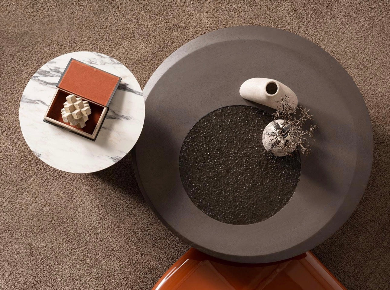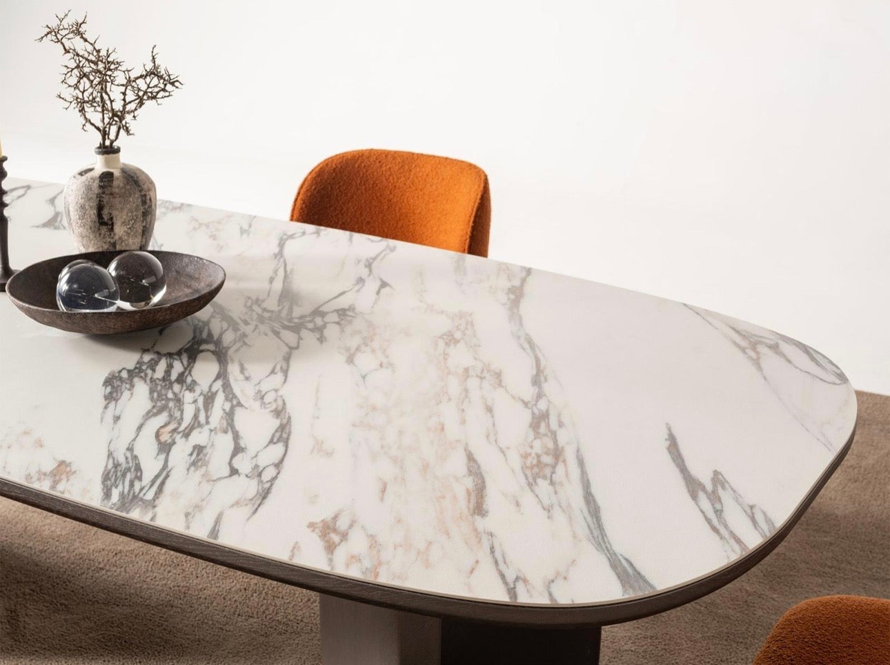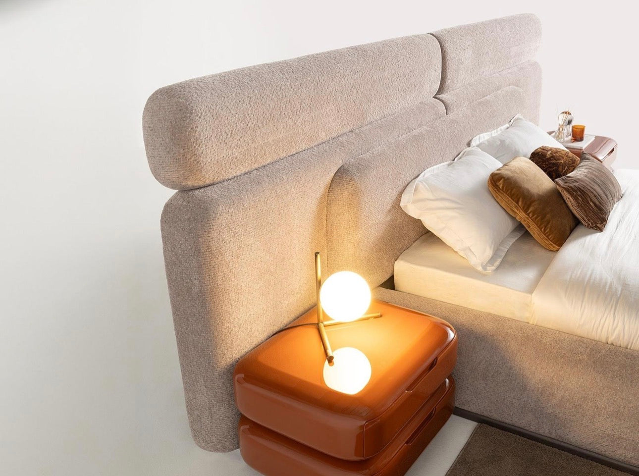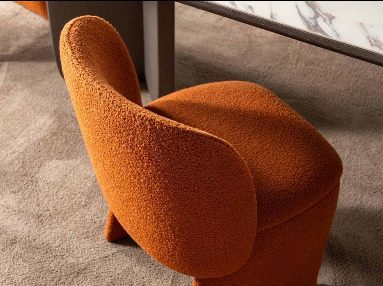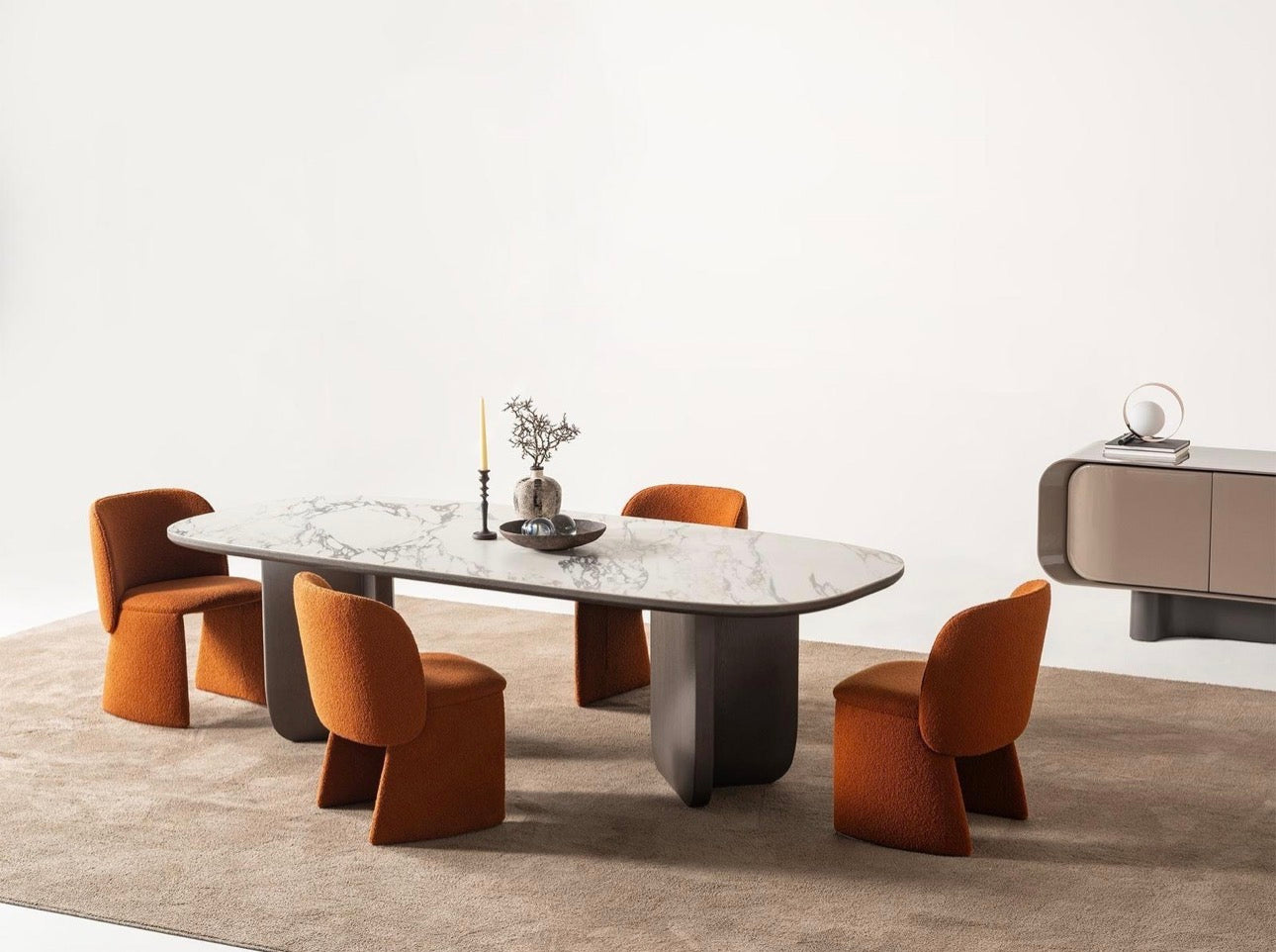 Urbane is a bold contemporary collection defined by smooth curves, sculptural silhouettes, and warm architectural color. Rich terracotta lacquer accents contrast with soft neutral upholstery and stone surfaces, creating a balance between modern sophistication and inviting warmth. Rounded nightstands, floating consoles, and statement dining pieces give the collection a fluid, gallery-like presence. Urbane is designed for interiors that embrace expressive design, modern comfort, and refined contemporary living.